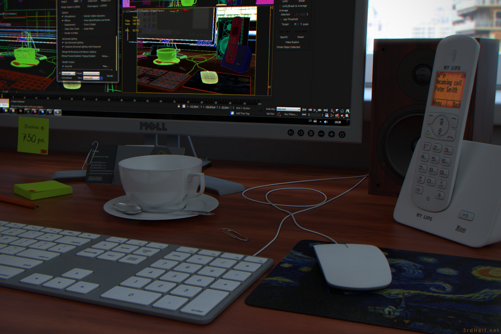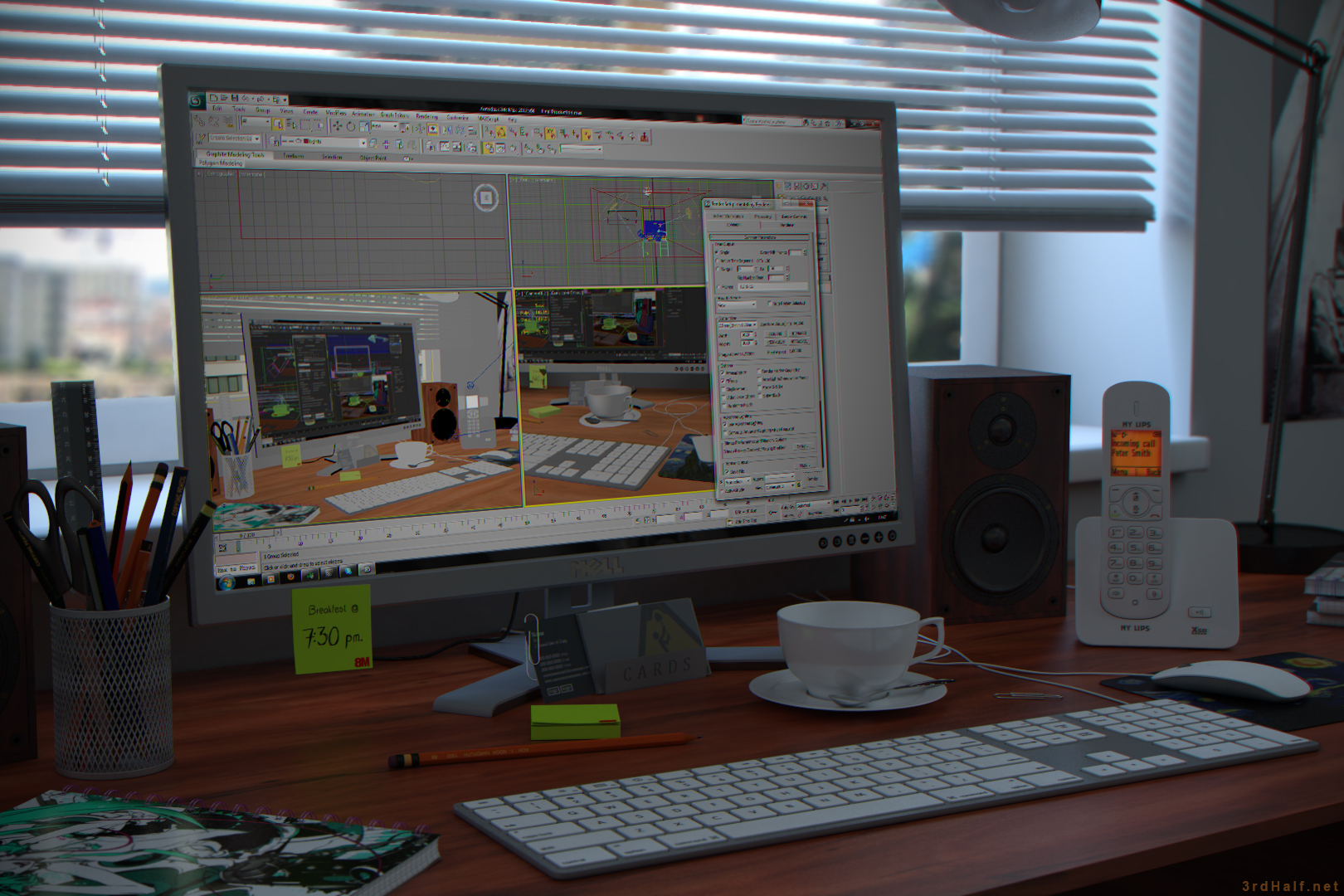 The project started with a fact, that in my personal object library had a few objects I had never used in any project. Object,  like telephone and keyboard.So I decided to create a scene, where I will be able to use them and the most obvious solution was, to create desktop workspase.