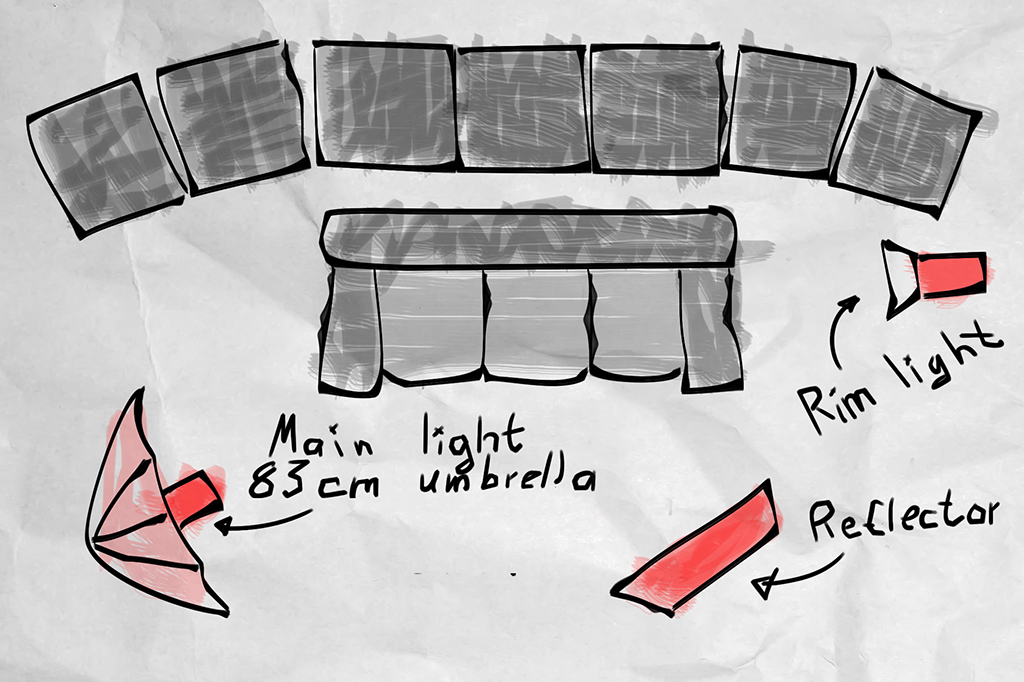 The lighting setup was as minimalist as possible. The main light used is single 33 inch umbrella. A piece of glossy tin sheet was used as reflector. And flash with snoot made from cardboard was added as rim light.